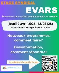 - Samedi 09 avril à Lucé: stage syndical « EVARS » (Education à la Vie Affective Relationnelle et Sexuelle)